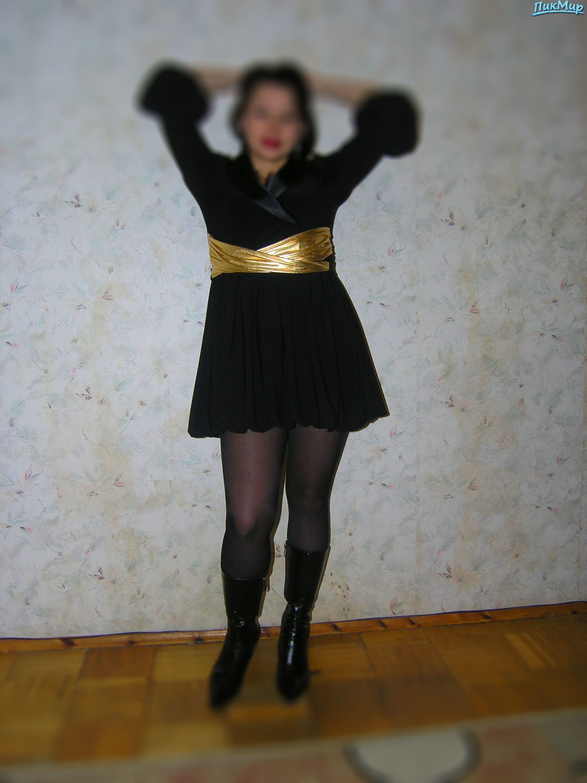 Короткое черное платье(с золотой вставкой в виде пояса), прозрачные затемненные колготки и короткие черные сапожки с каблуком создают неповторимую ауру. Ее гибкость и ловкость(как кошка) только усиливают мою страсть к ней. Я в восторге от нее!Очень красивый архивный фотосет! Она так шикарно позирует на камеру!Показывает свои сочные половые губы и шикарную задницу!Красивая,сексуальная жена!