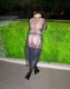 позирует дома и на улице одеты чёрные чулки сверху всё прозрачное есть тату на теле