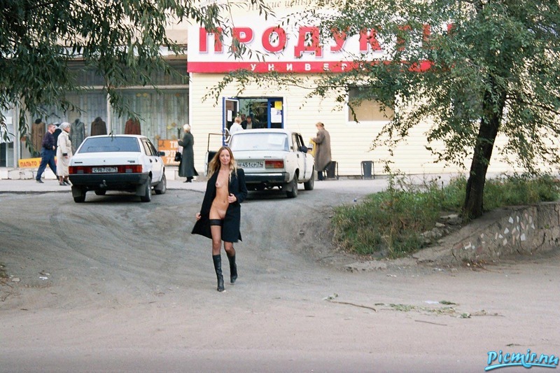 Привлекательна стройная загорелая самочка по улицам городка гуляющая в расстёгнутом пальтишко на голое тело накинутом!