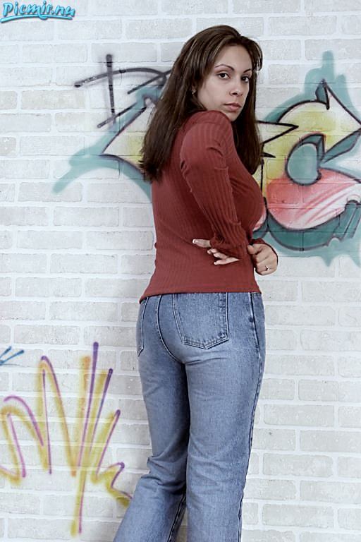 Интересно позирует у стены с граффити девка с аппетитным телом!