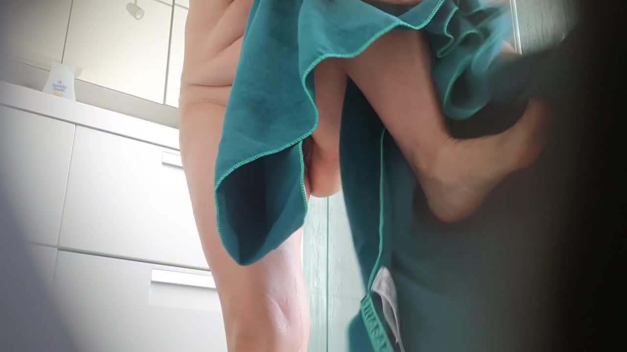 Зрелая пышная дама тчательно вытирает свое тело после душа, не подозревая о спрятанной камере.