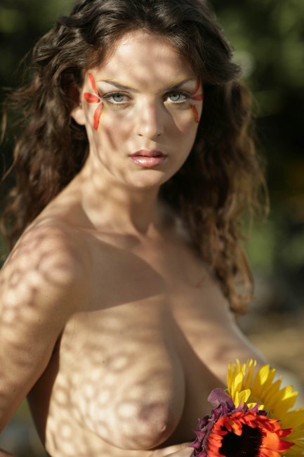 Пышная,сочная,доспелая,красивая с мясистыми сиськами и пышными волосами модель показывает себя на опушке леса.Везет же фотографу.