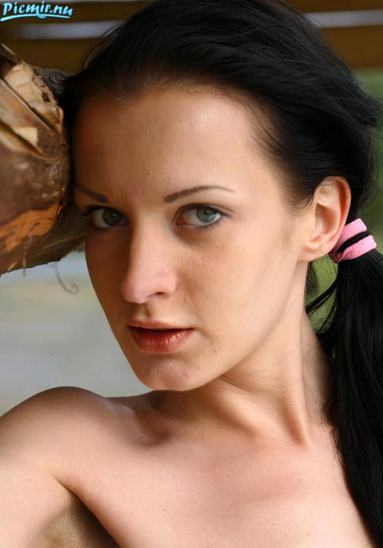 Брюнетка позирует в поле возле не достроеной постройке похожее на колодец, из одежды коротенькое красно белое платьице, на ногах черненькие босоножки, интим место аккуратненько подстрижено, грудь небольшого размера, и вся эта красота на фоне зеленой травки и деревьев