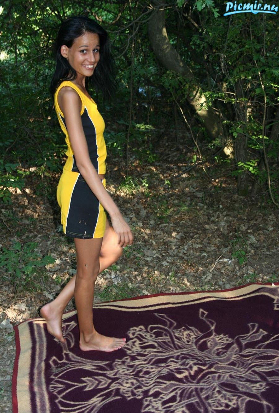 Худенькая брюнетка занимается сексом с парнем в лесу