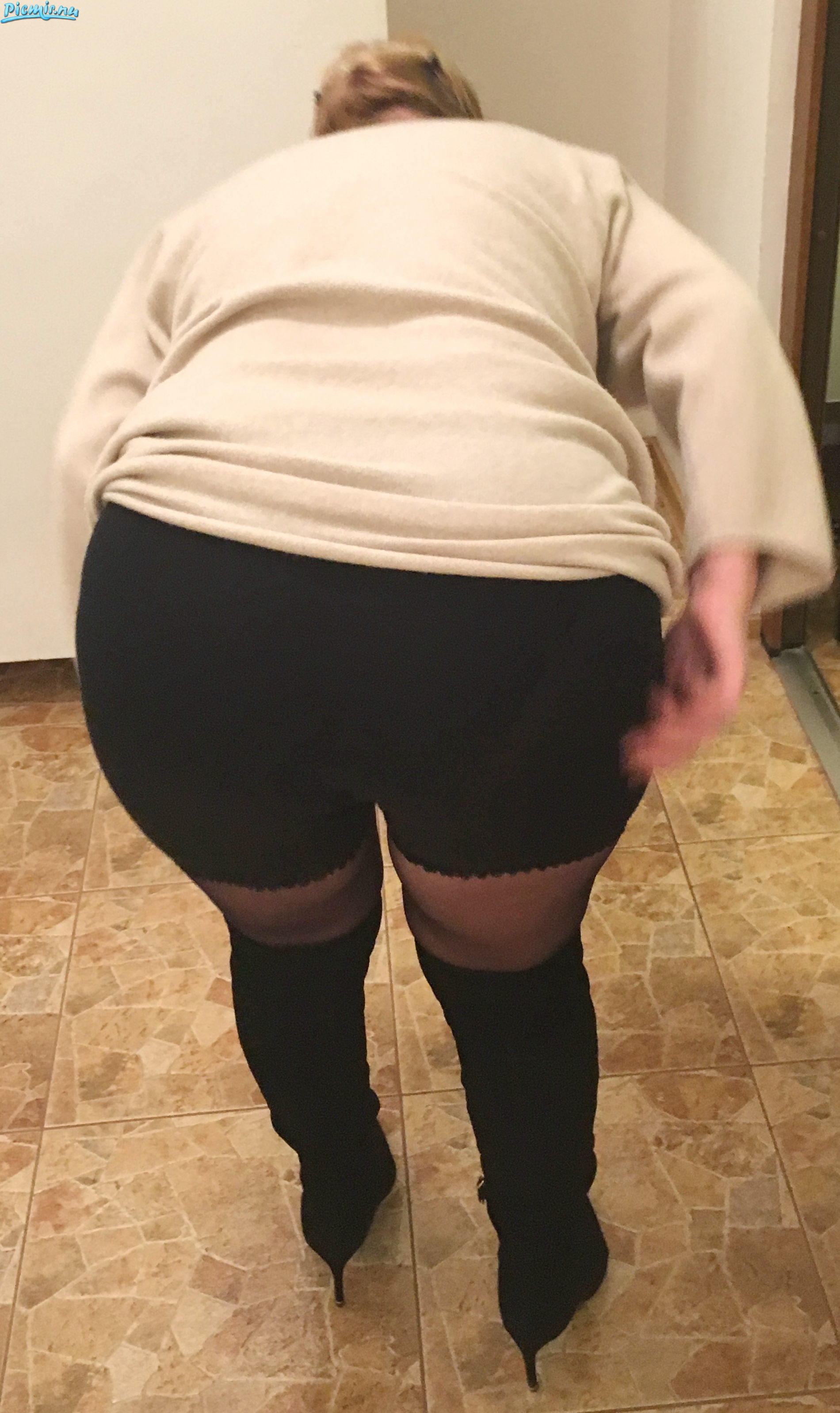 Пушина пришла вся в черном - сапоги, колготки, трусы и панталоны. Сначала позировала в своем. Потом постепенно разделась и одела длинные трусы в обтяжку. Встала к столу и началось...
