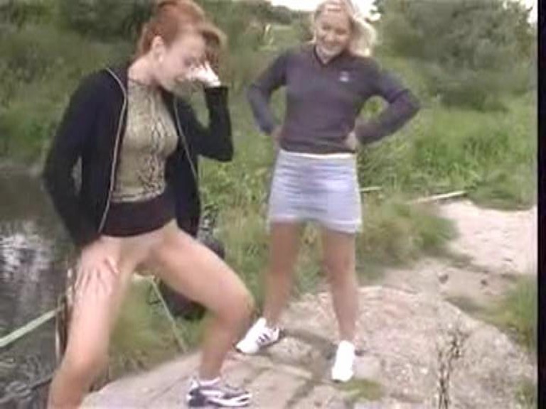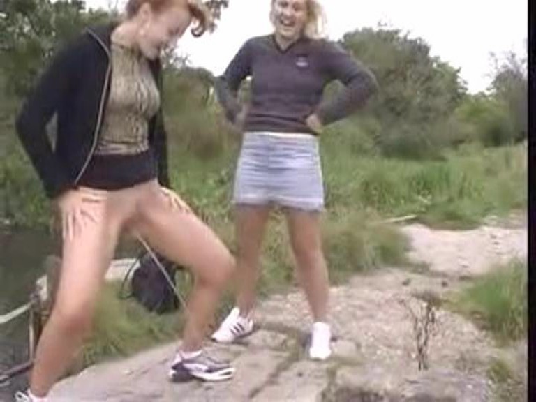 Две девахи на мосту, одна из них пускает струйку, а вторая с восторгом наблюдает за этим действом...