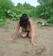 Брюнетка с роскошными формами устроила стриптиз на берегу водоема.