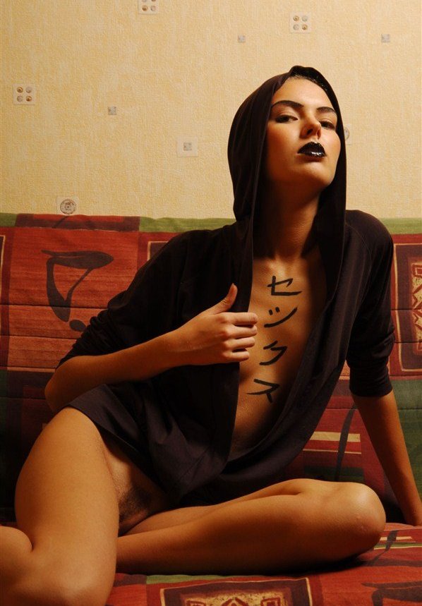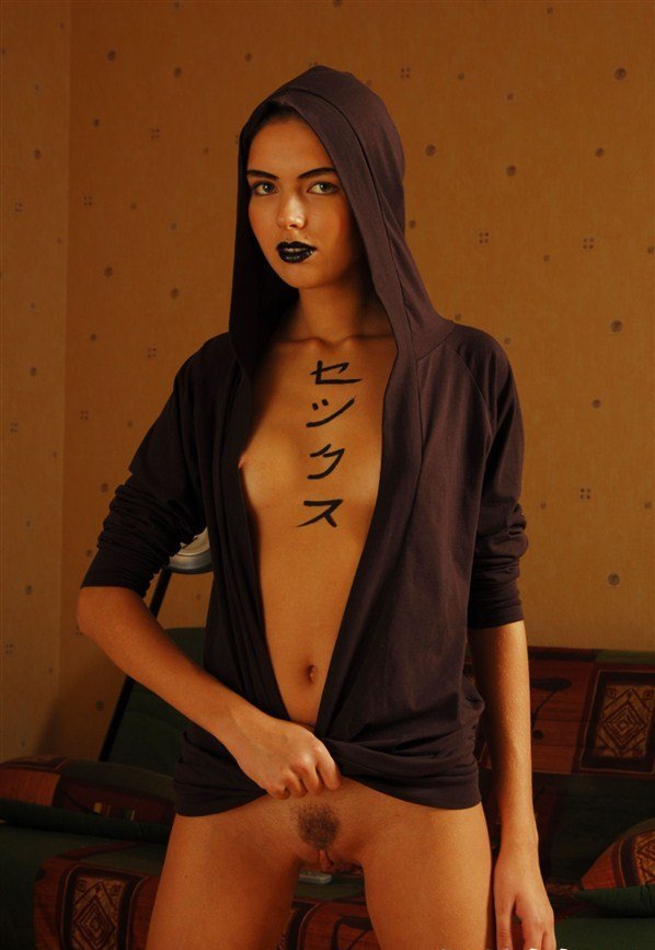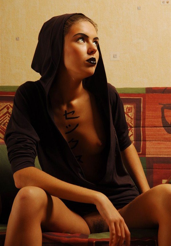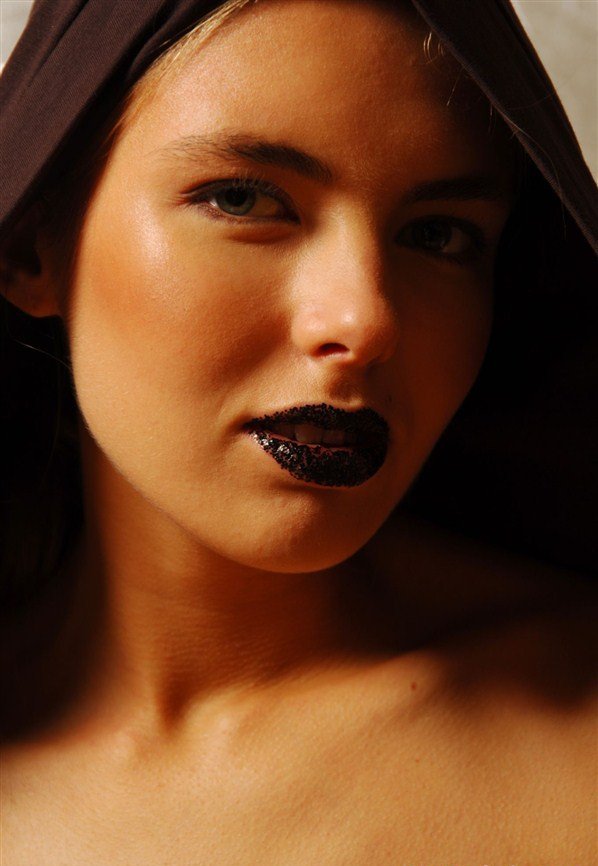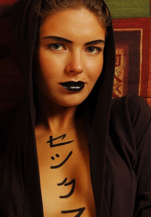 Губы чёрные. И какие-то непонятные символы, на теле. Можно в ночи испугаться.