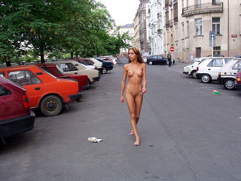 Стройная девочка совершает пешею прогулку голышом,интересное решение.
