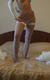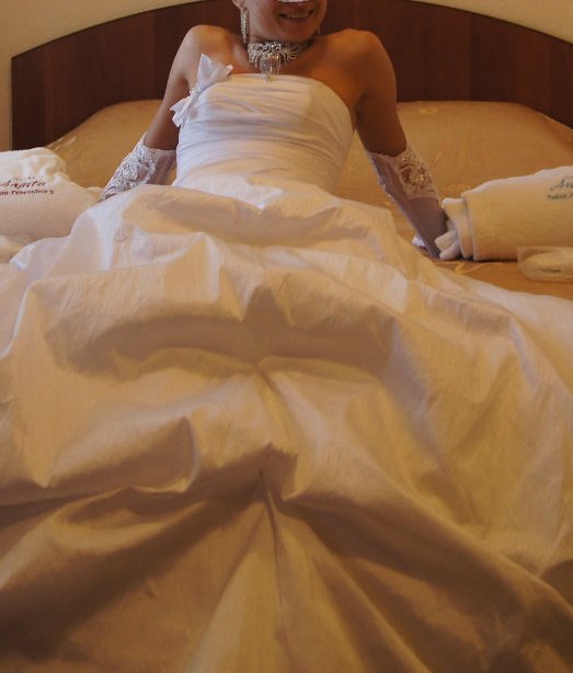 Невеста позирует в номере отеля. В платье, чулках и красивых трусиках.