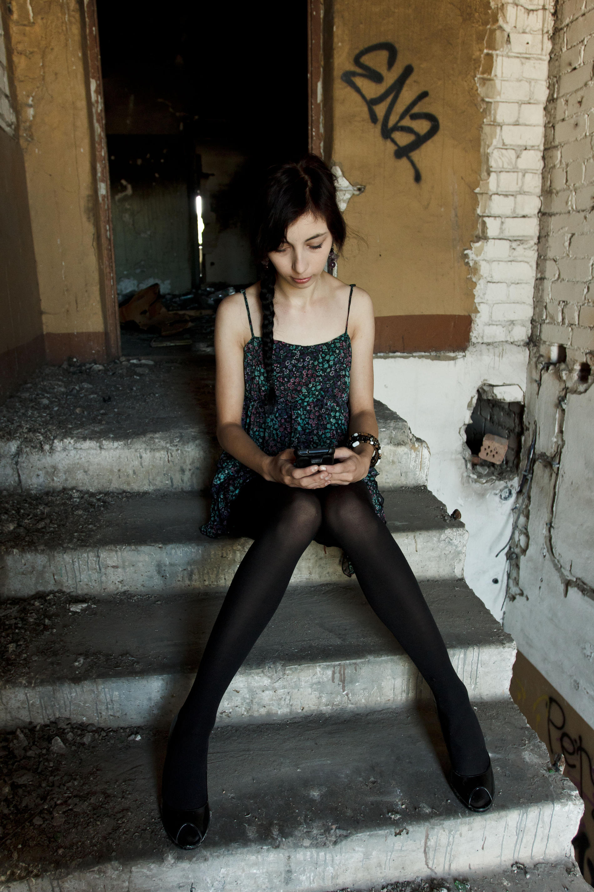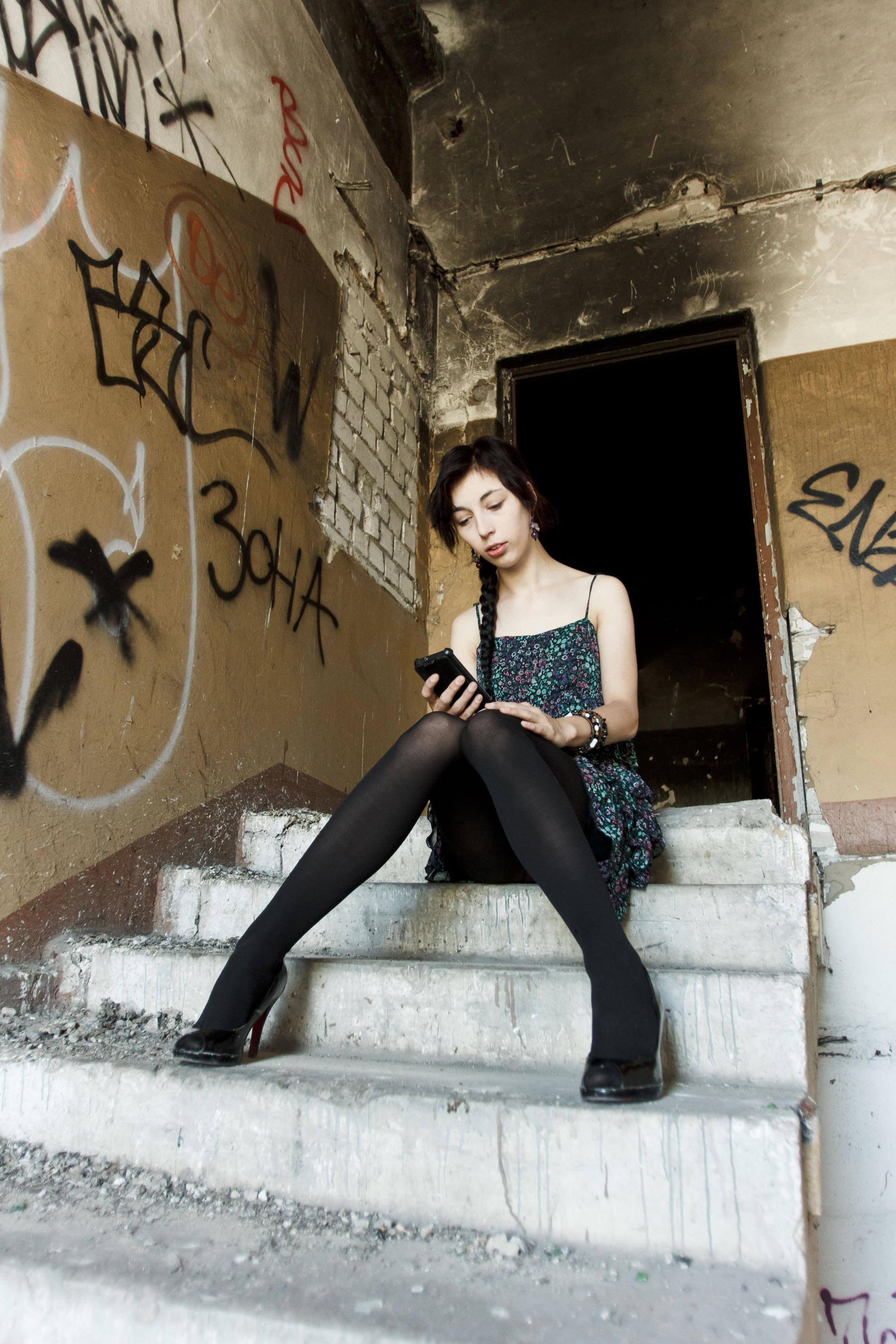 девушка в чёрных колготах сидит в подъезде и играется со своими влажными дырочками