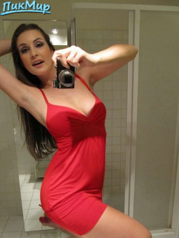 Красивая брюнетка прелестна в своём зеркальном отражении как голышом, так и в своём красном платьишке!