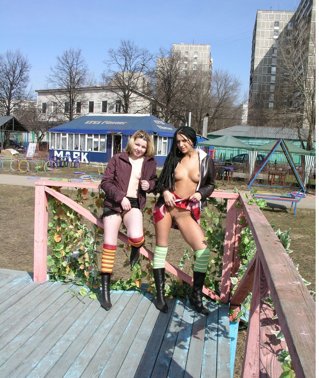 Барышни позируют на свежем воздухе, оголяя свои сладкие прелести