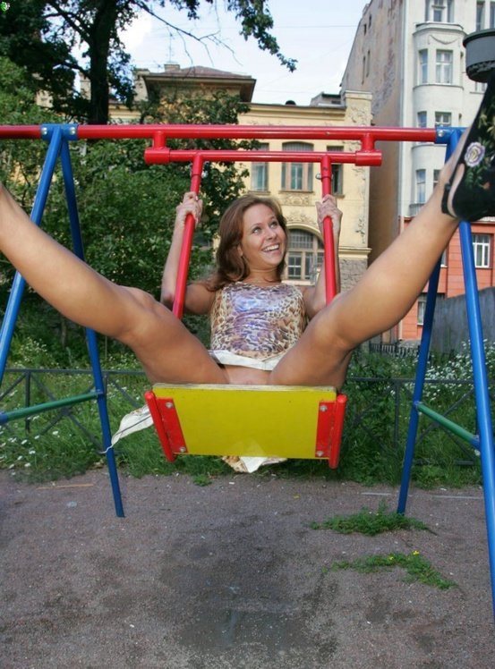 Стройная красотка позирует на детской площадке, судя по тому, что нет детей - раннее утро.
