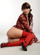 демонстрирует своё красивое тело в эротичном белье и красных чулочках.
