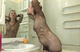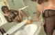 позирует в ванной комнате и демонстрирует своё волосатое тело.