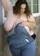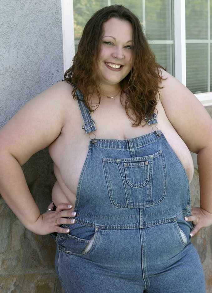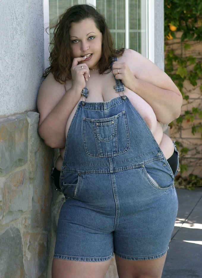 Прекрасная толстушка в комбинезоне показывает свою грудь