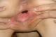 Стройная милашка скромно позирует на фоне шторы а потом демонстрирует свои дырочки и залитый спермой лобок.