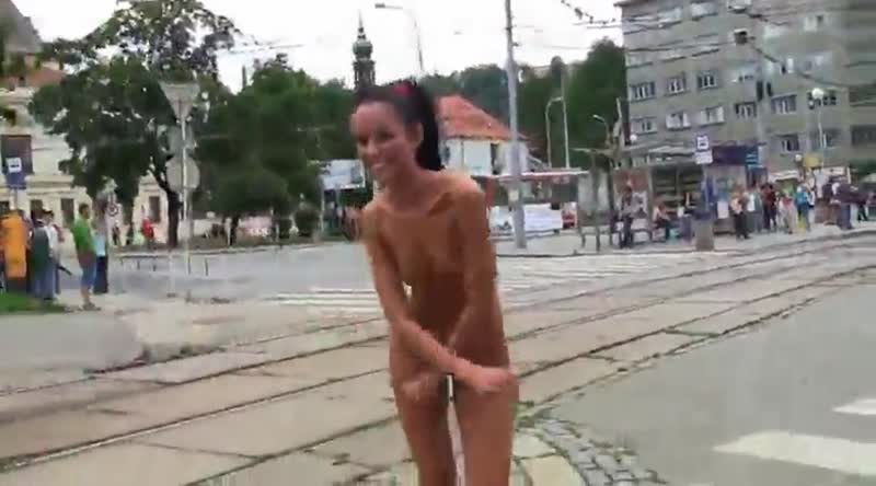 Милашка голенькой позирует на многолюдной улице