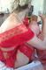 Стройная блондинка в красном белье и чулках позирует партнеру с бокалом шампанского в руках.