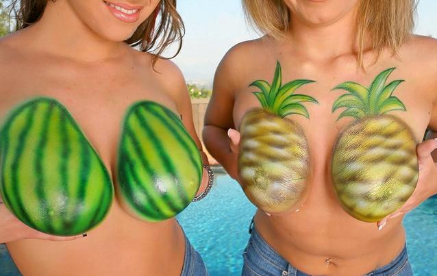 2 девахи показали свои арбузики и ананасы и трахнули вдвоем мужика.