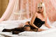 блондиночка расположилась на кроватке надев на себя нижнее бельё чёрненького цвета и начала кокетничать с фотографом а для юута ещё и прозрачненький балдахинчик повесила