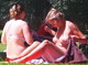 Две подружки на отдыхе в парке в яркий солнечный день.