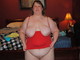 Пышная женщина в яркой алой футболке показывает себя в спальне.