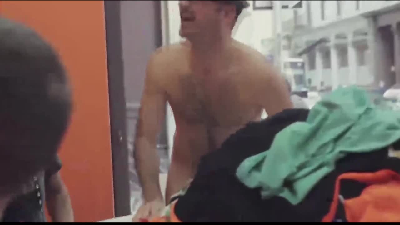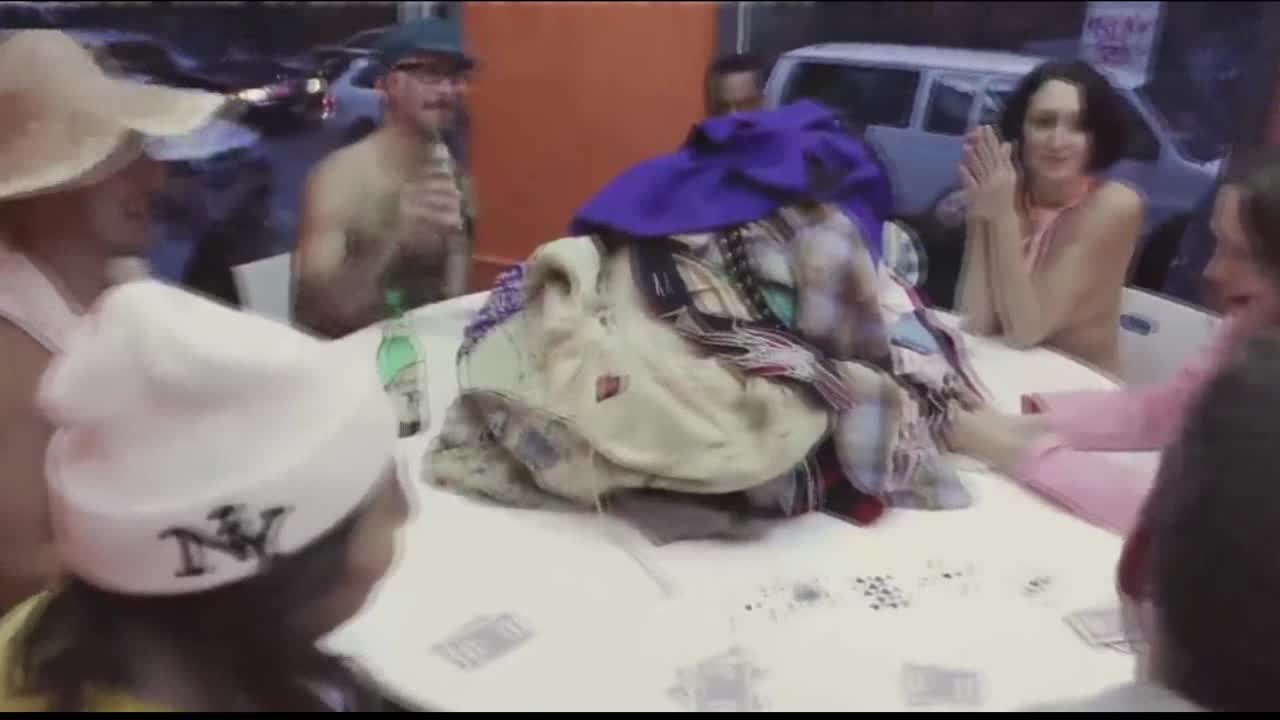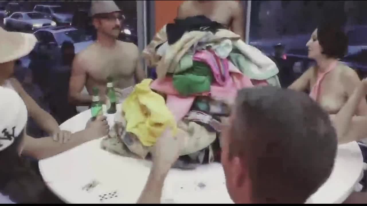 Группа мальчиков и девочек играет в карты, проигравший раздевается на глазах у прохожих на улице