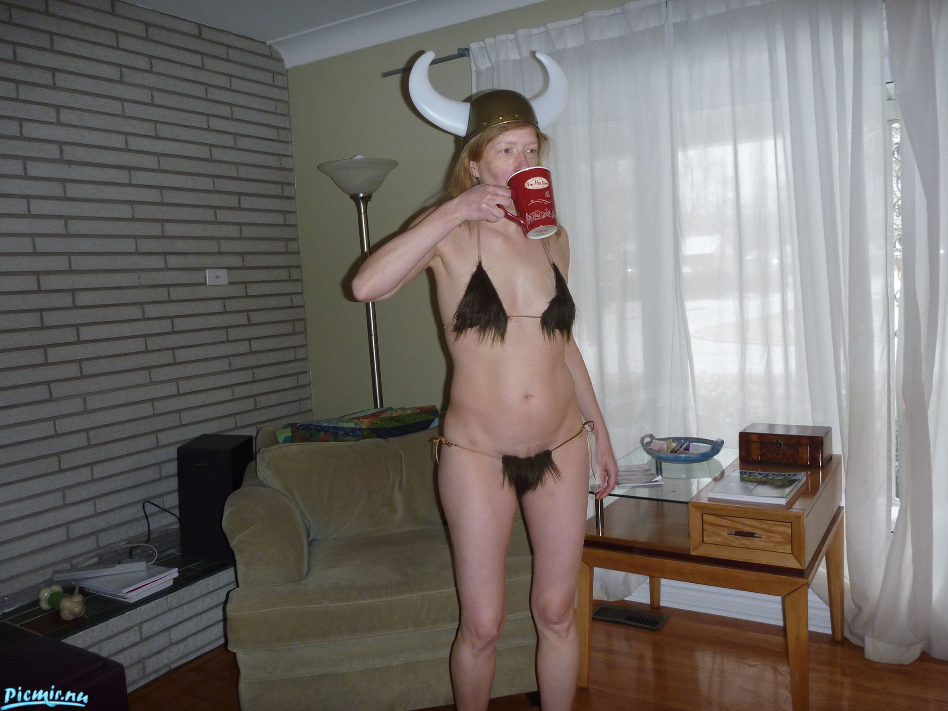 Худенькая зрелая блондинка позирует в шлеме викингов