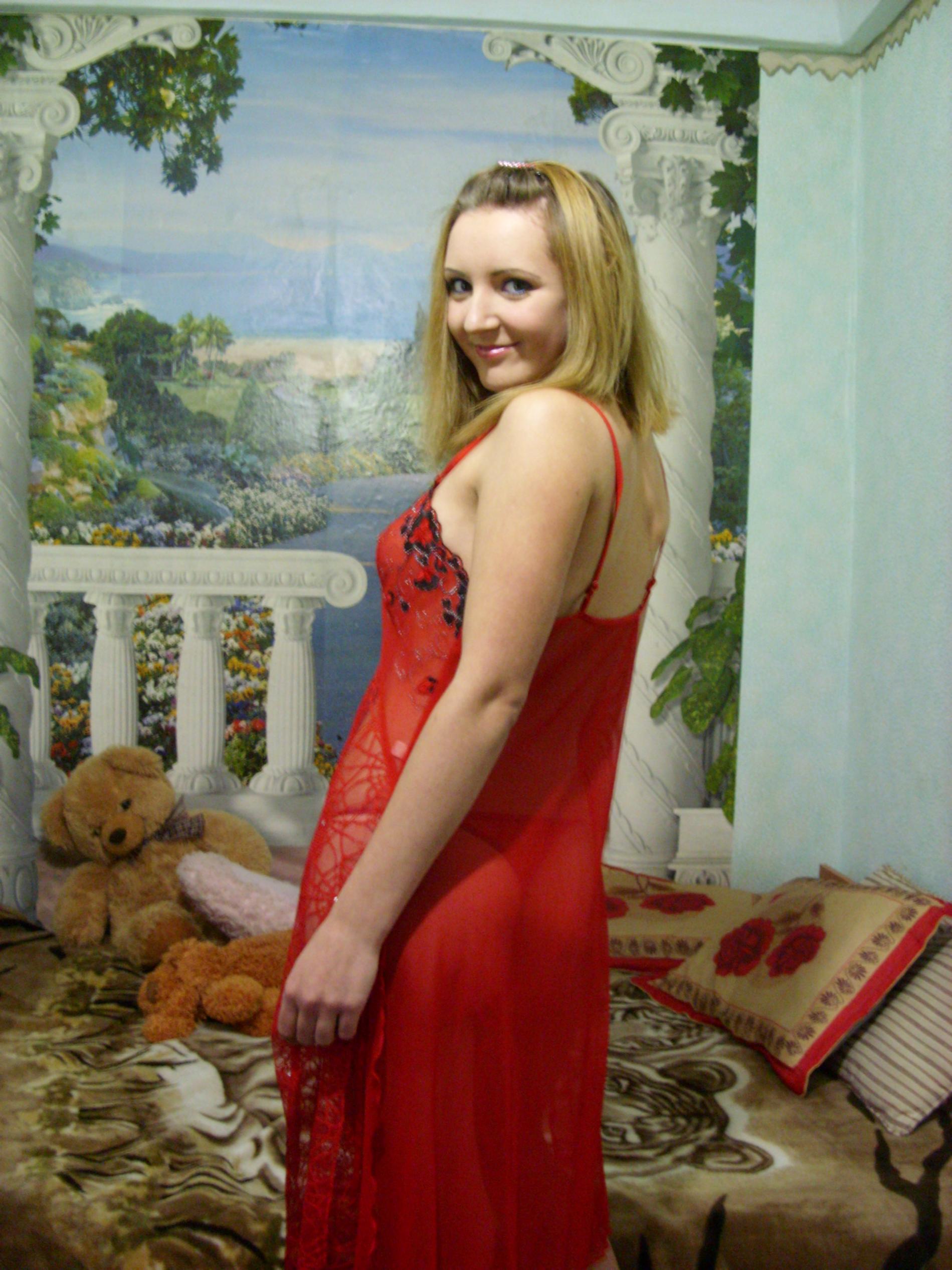 Очень красивая девушка игриво позирует в красном пеньюаре. Очень откровенная девушка!