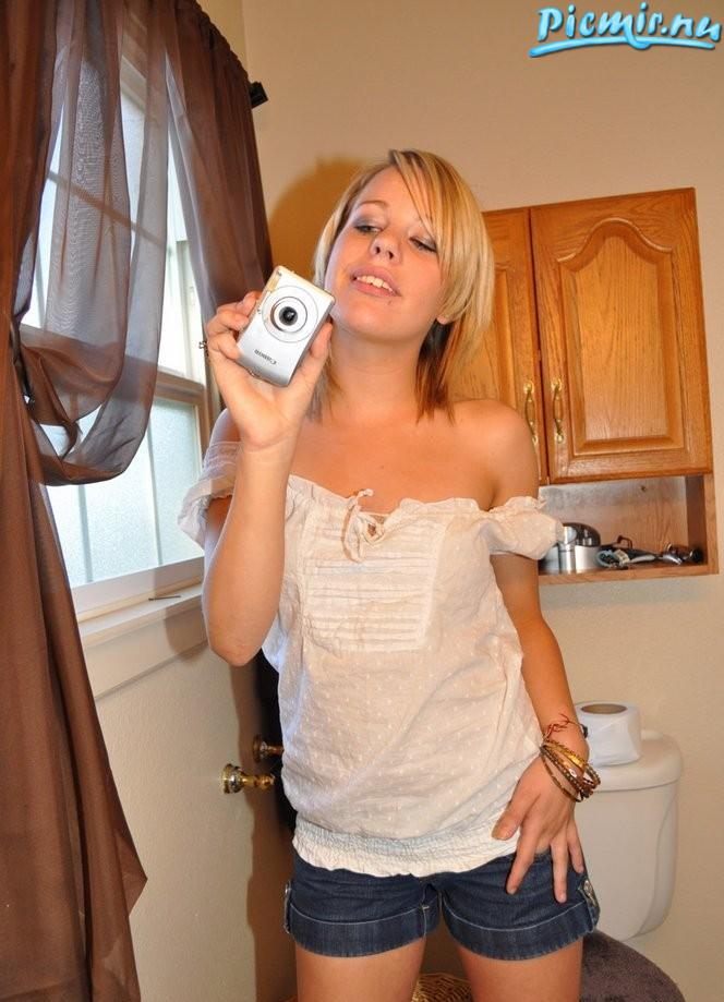 Блондинка фотографирует себя в ванной комнате постепенно оголяясь