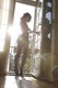 Красивая девушка в колготках позирует у открытой двери балкона