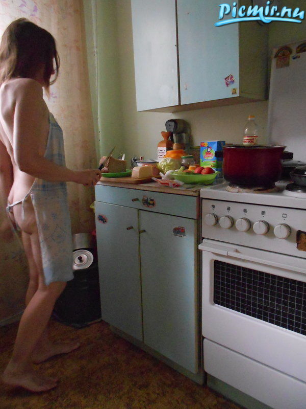 Художественно на кухне готовит. И да, в белом платье, на голое тело. Она стильно смотрится.