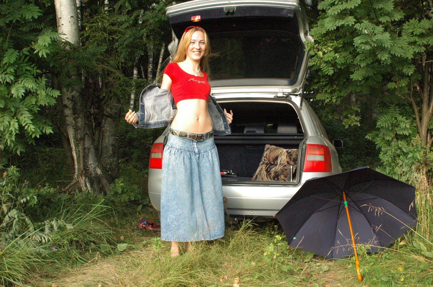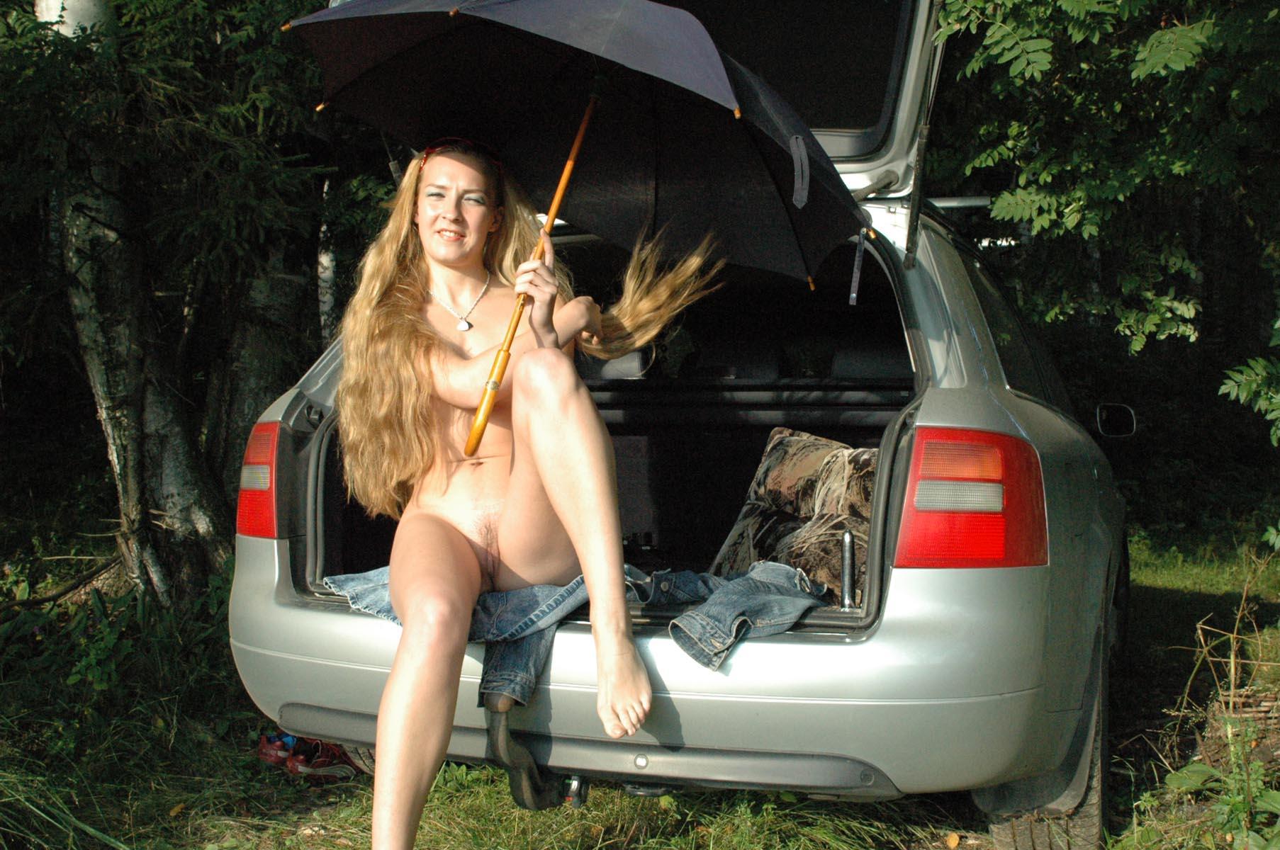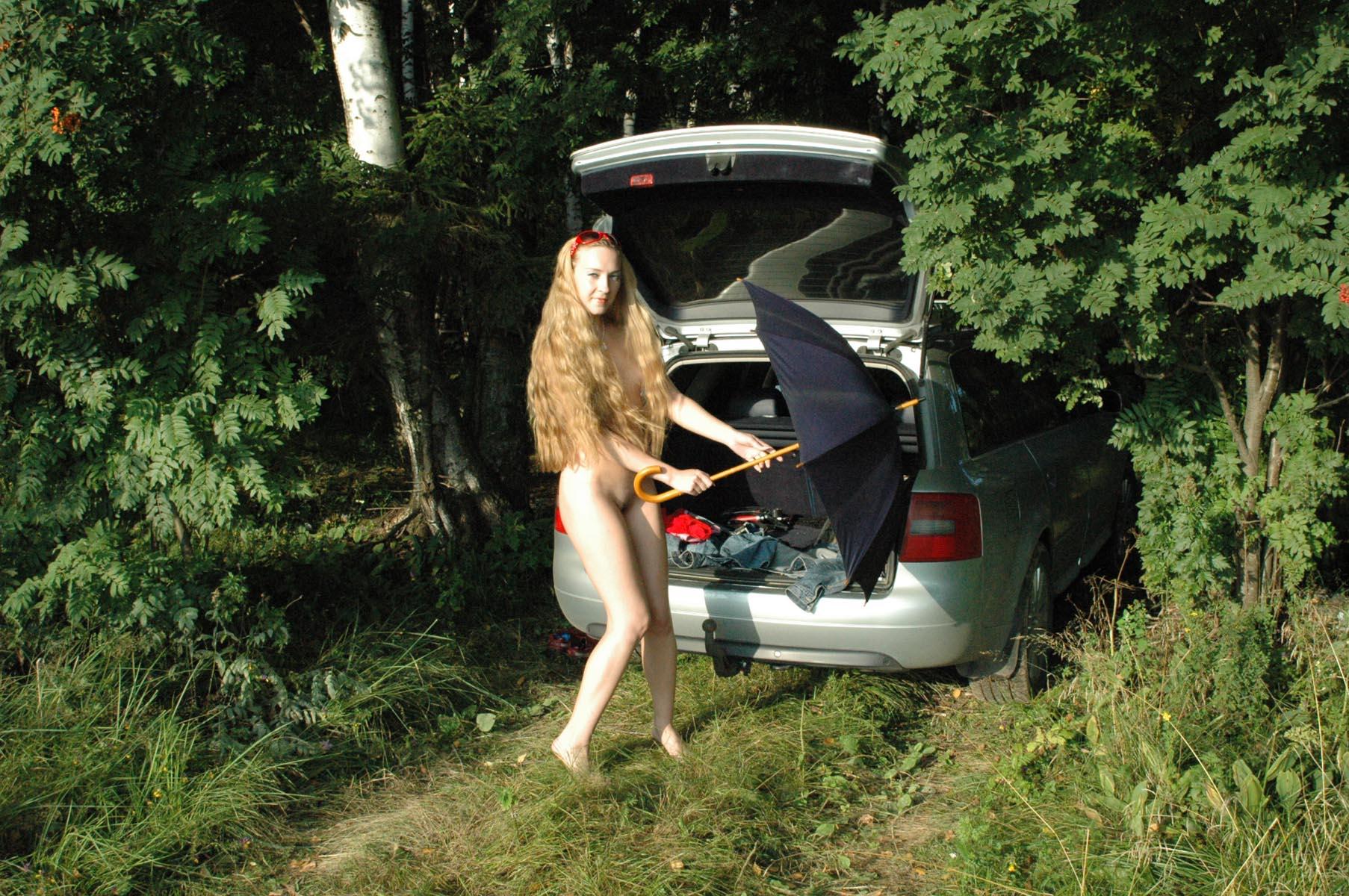 Очарован баловничкой Асей на природе у машины озорничающей голой на камеру!