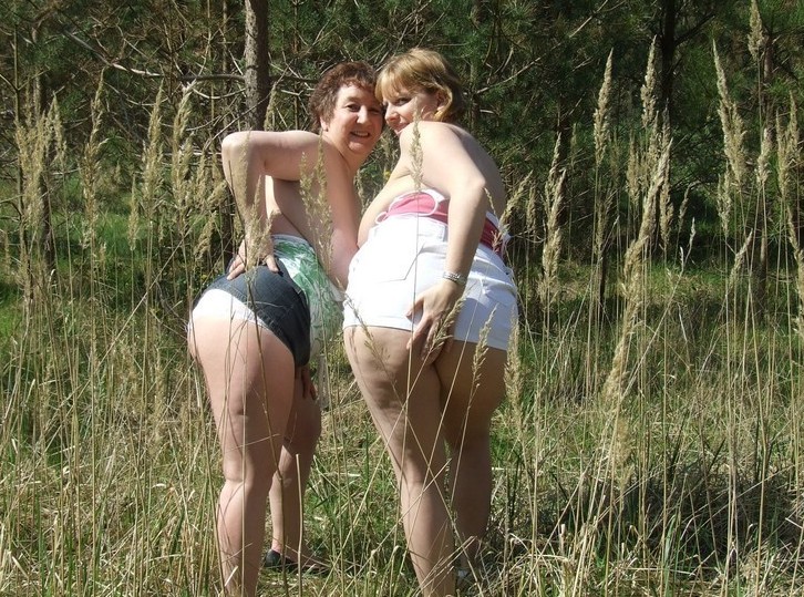 Две взрослые пышные женщины, теплым деньком, выбрались на природу, и на лесной полянке решили устроить коллективный стриптиз.