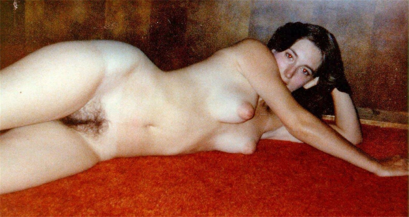 Любительские ретро-фото женщины с необычной формой груди и волосатой киской.