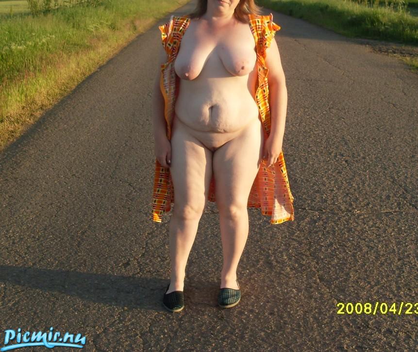 Миловидная крестьяночка, с бритым лобком, налитыми сиськами, прямо на дороге устороила стриптиз, так по домашнему в халате и тапках.
