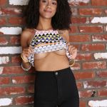 Симпатичная девочка у стены застенчиво демонстрирует свои прелести...