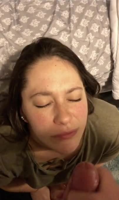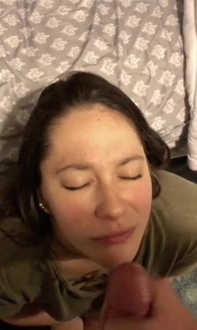 Сосет хуй и подставляет лицо под выстрелы спермы