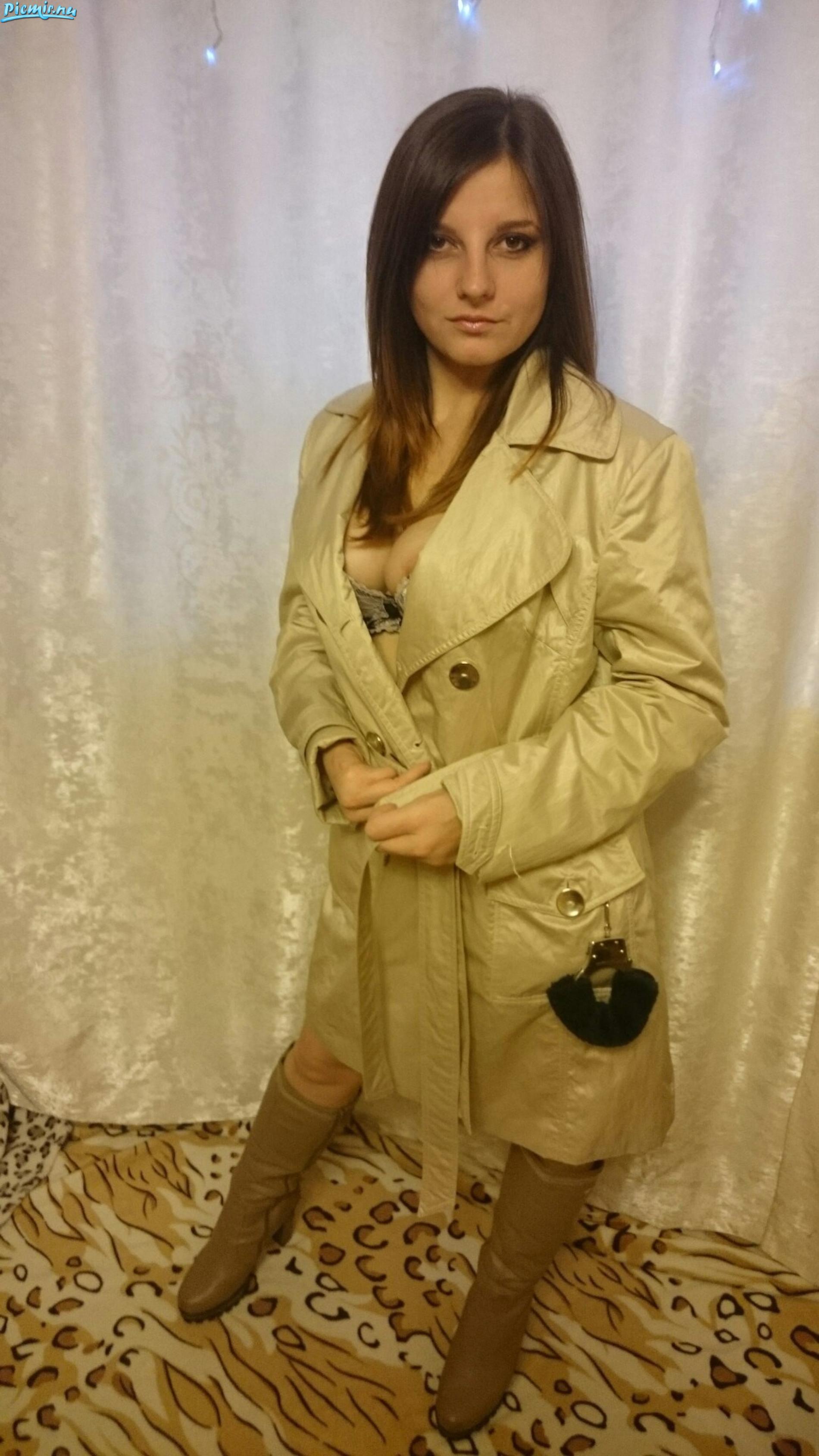 пикантная задумка , под плащем без трусиков , симпатичная девонька