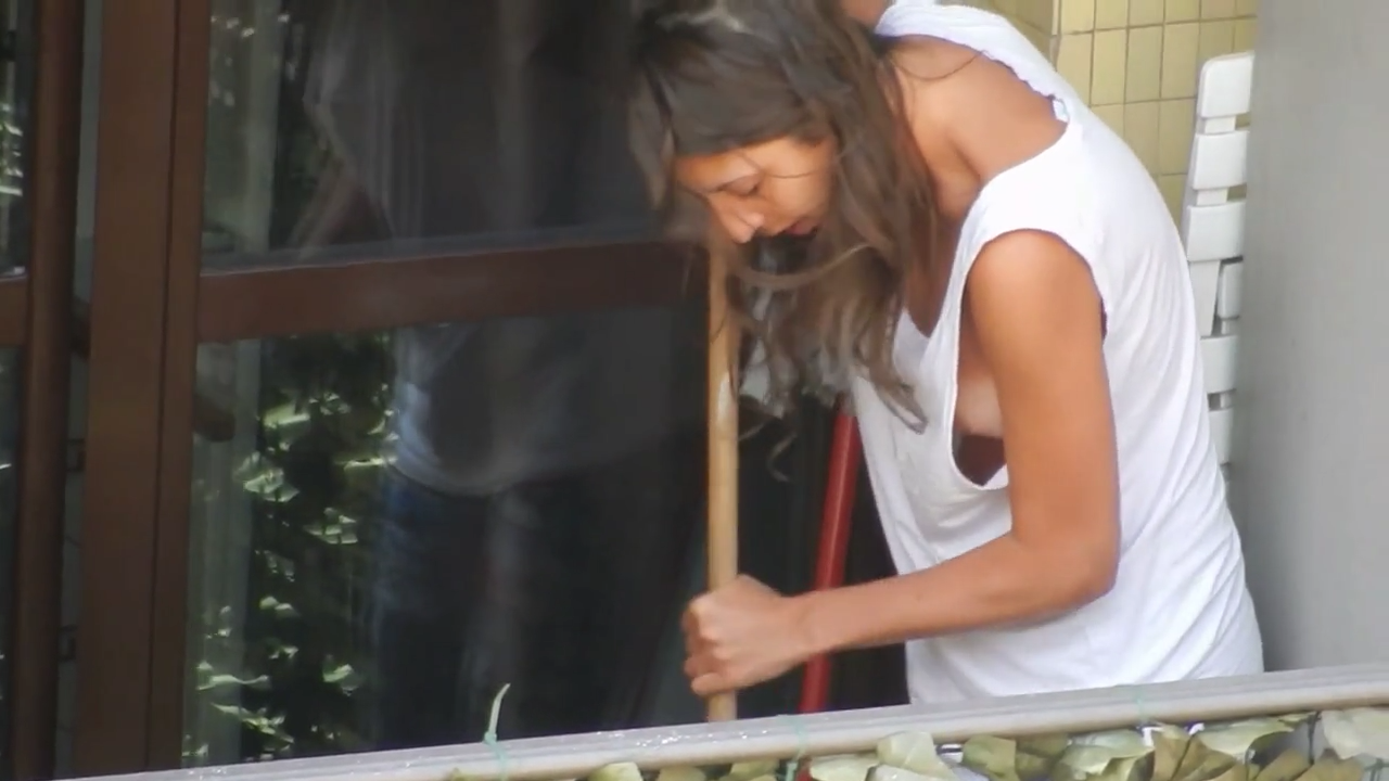 Женщина в доме напротив моет пол на балконе в растянуть майку. В вырезе сбоку открывается прекрасный вид на её неплохую грудь. Видео в коллекцию любителей данного жанра. Не постановка.