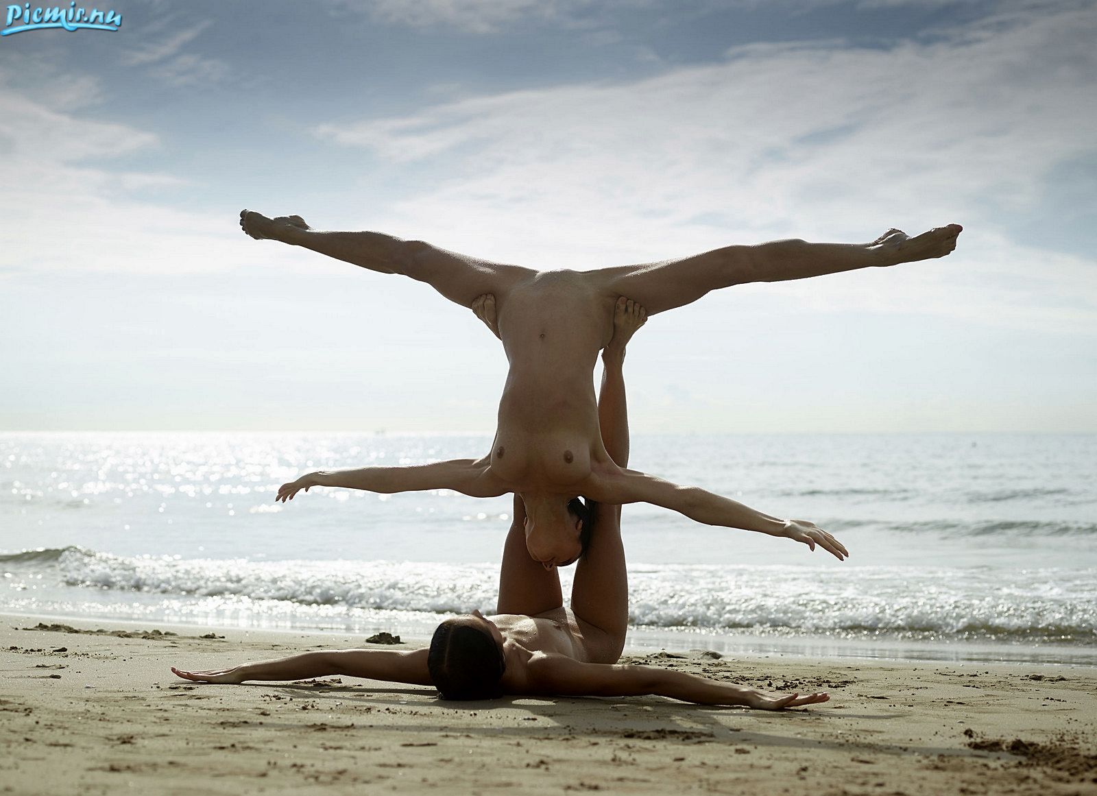 Обнаженные гибкие близняшки делают спортивные фигуры на пляже.