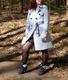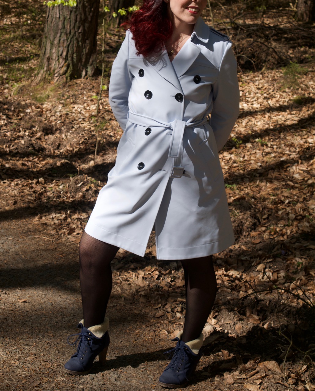 дамочка прогуливается по лесу в чулках и в плаще на голое тело