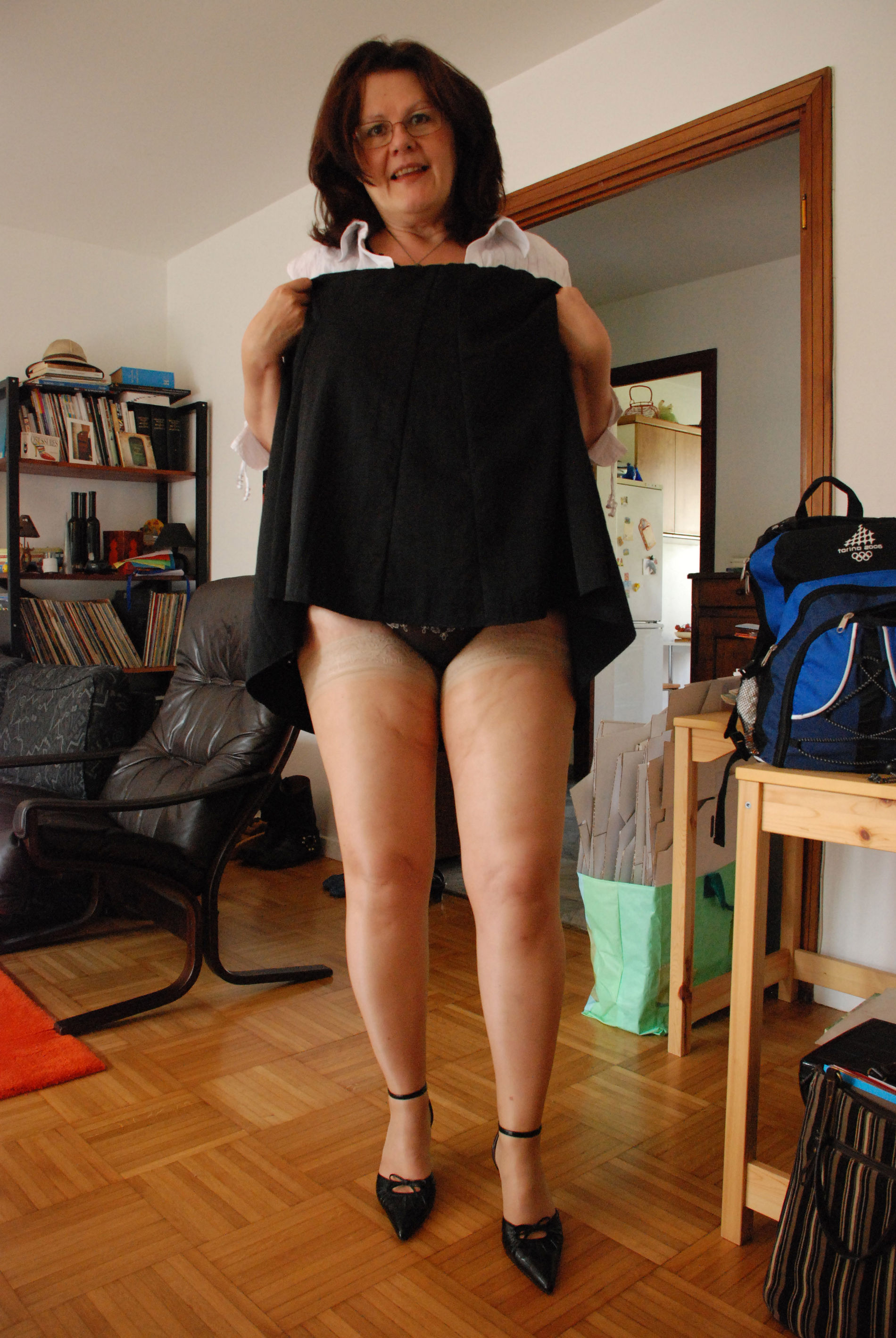 Прелесть! Дама хороша и в чулках и в колготках без трусиков