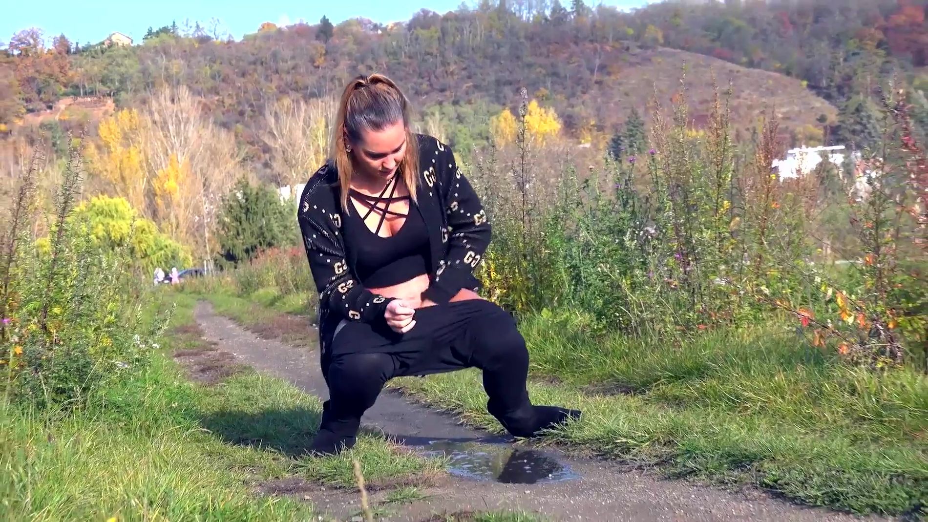 Симпатичная молодая девушка на сносях решила брызнуть на проселочной дороге... Девушка симпатичная, видео - тоже ничего. Любителям золотых струек посвящается. Приятного просмотра.