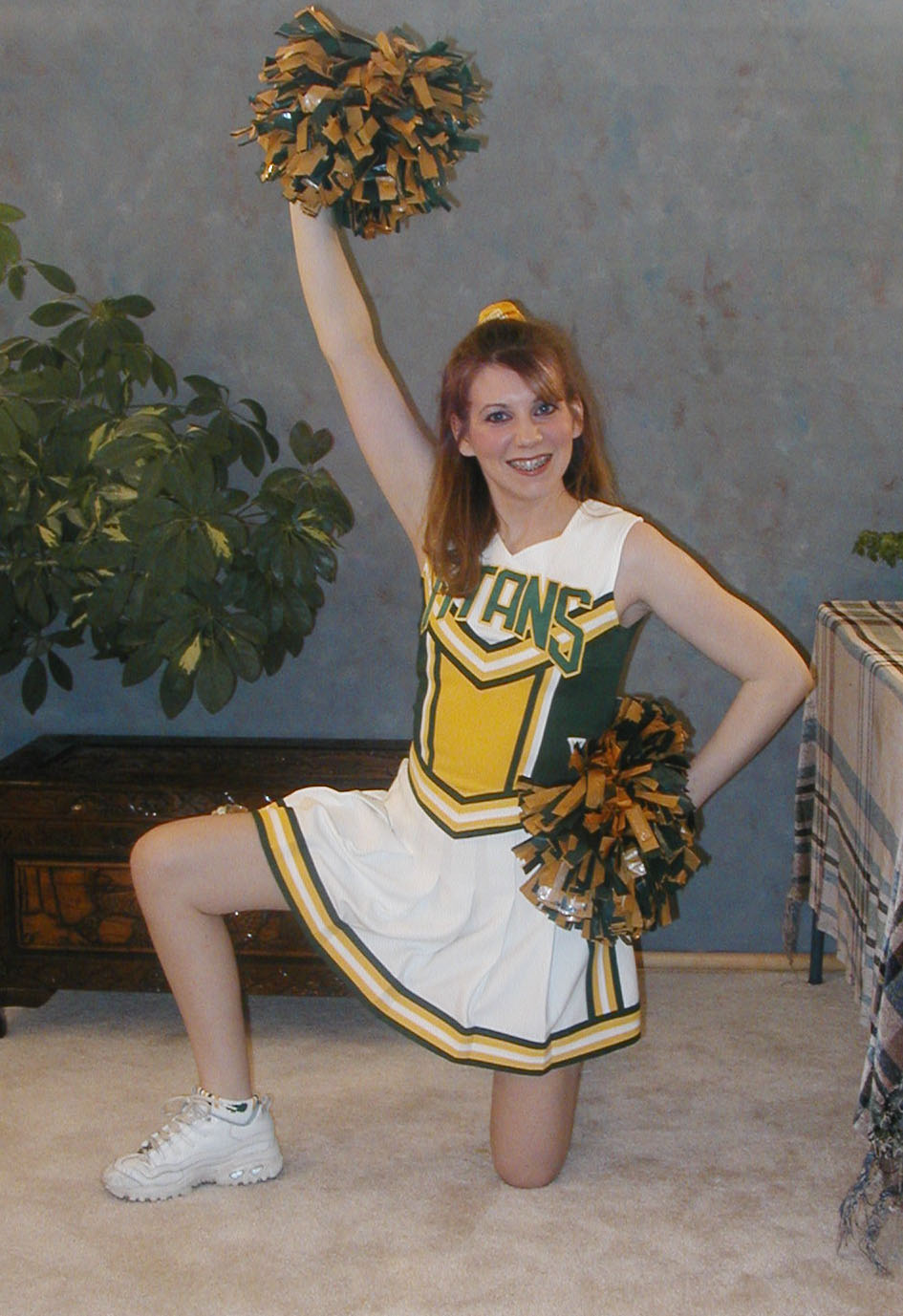 Милая дама красиво и сексуально позирует в костюме черлидерши, радуя своего мужа.