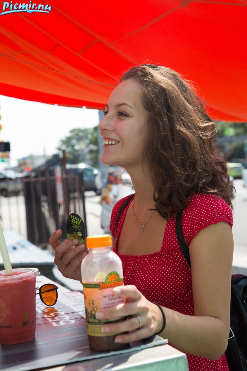 Красивая девочка в красном платье шалит на улице и показывает свои красивые сисечки и попочку