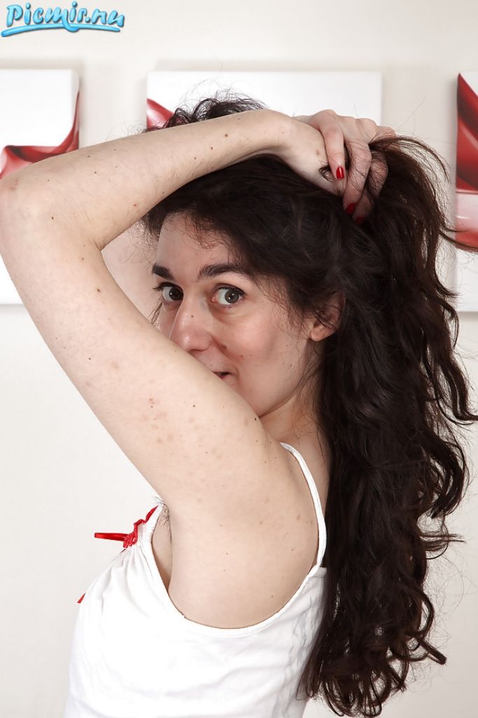 Волосатая киска зрелой брюнетки с волосатыми подмышками и крошечными сиськами.