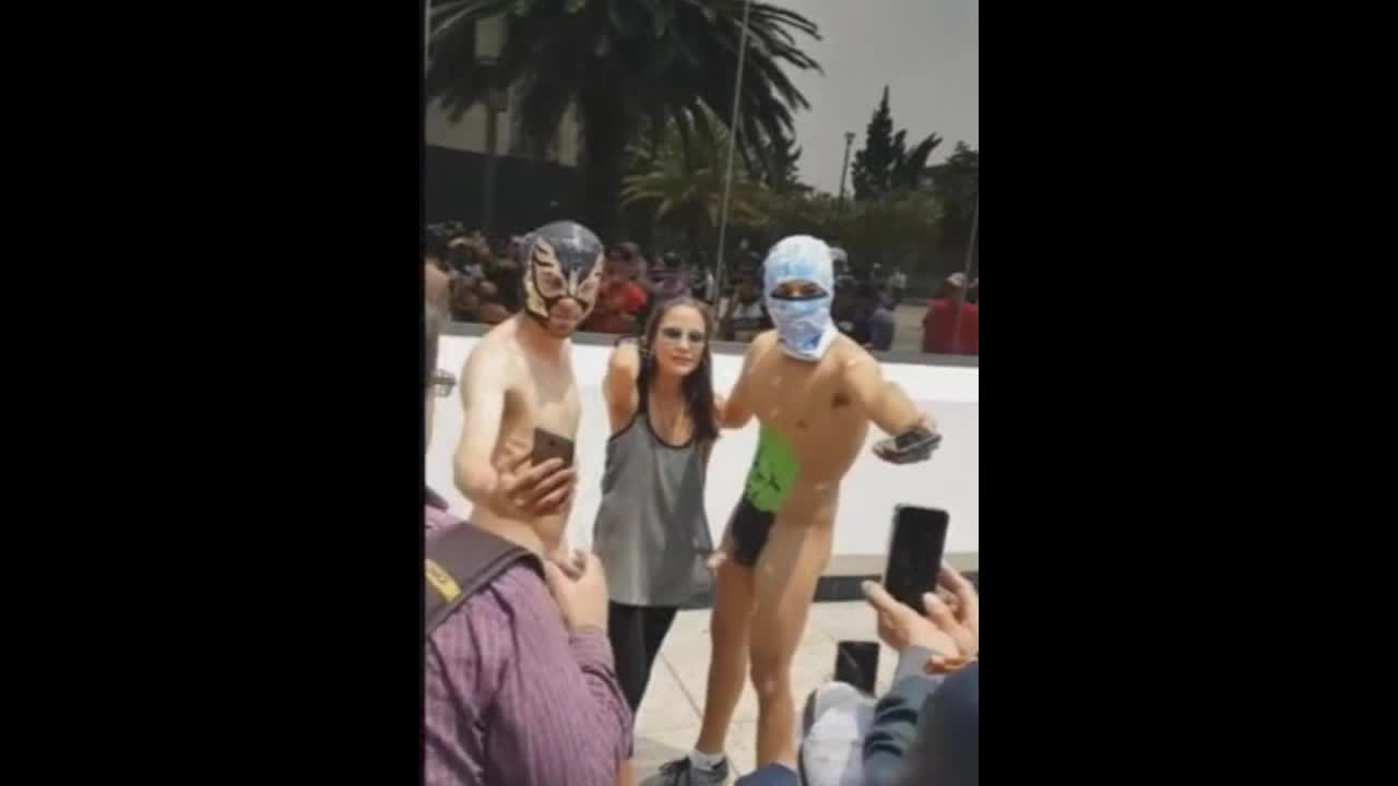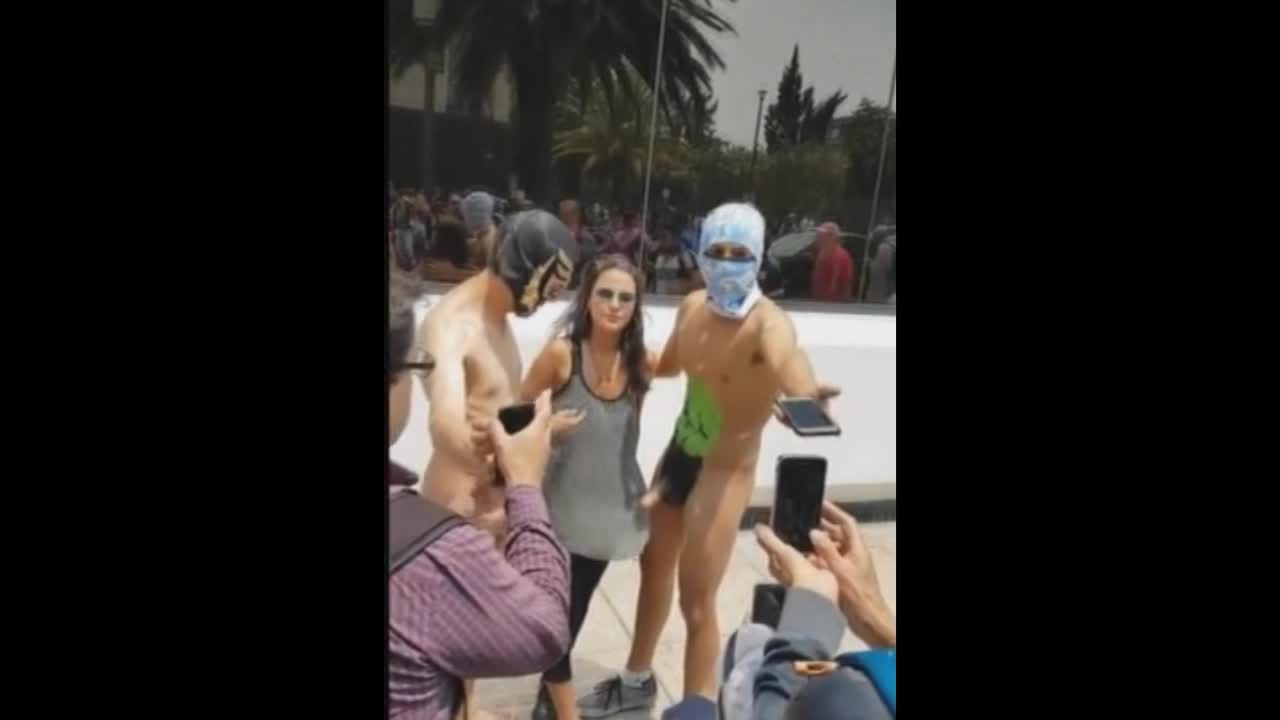 Девушка фотографируется на улице в Испании с двумя парнями с большими членами.